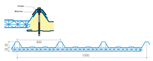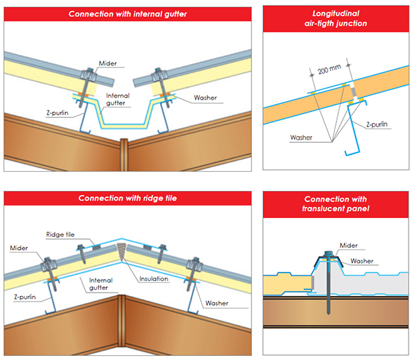 On the middle purlins, binding is made on every two ribs in a shifted way. During installation, the panels should be fastened tightly on the longitudinal part in order to ensure a proper seal of air-tightness joint.