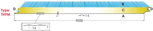 | A | EXTERNAL STEEL SUPPORT | Slightly ribbed profile (THPC) or low ribbed profile (THPM) Thickness : 0.4 mm – 0.5 mm – 0.6 mm – 0.7 mm Standard: Prepainted galvanized steel support with polyester 25μ top coat- PVDF and plastisol top coats available on request Aluminium, Alu Zinc and Inox coating steel available on request. |