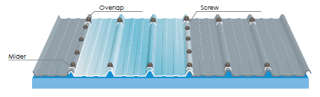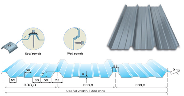 The profiled cladding sheets nervesco 3.45.1000TS type are used in dry covering and vertical walls for industrial buildings, tertiary buildings, shopping centers, production workshops, agricultural storehouses and dwellings.