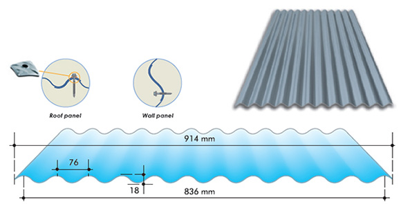 The corrugated cladding sheets 76.18 type are used in dry covering and vertical walls for industrial buildings, tertiary buildings, shopping centers, production workshops, agricultural storehouses and dwellings.
