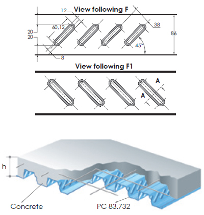 Caractéristiques techniquesPC83.732 is a ribbed steel sheet with bosses in the souls for shuttering and reinforcing concrete.